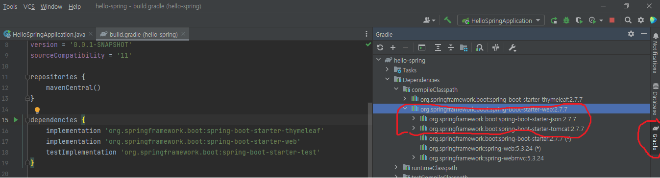 Gradle을 통해 라이브러리들에 대한 Dependency들을 관리한다. 최초 spring boot생성시에 2개 thymeleaf와 springboot web만 선택했으나 dependency에 의해 필요한 모든 라이브러리들이 함께 딸려온다. Gradel탭을 눌러보면 처음 추가한 starter web을 통해 tomcat라이브러리도 딸려온 것을 알 수 있다.