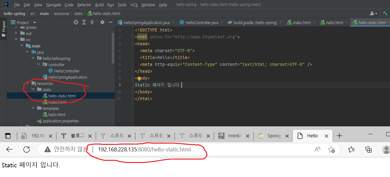 - static폴더 밑에 hello-static.html페이지를 예제로 만들어 출력해 봄.
