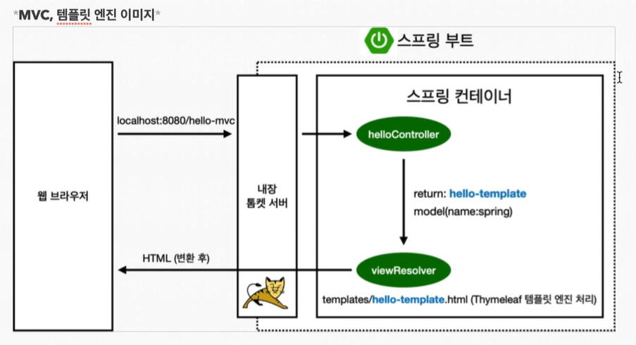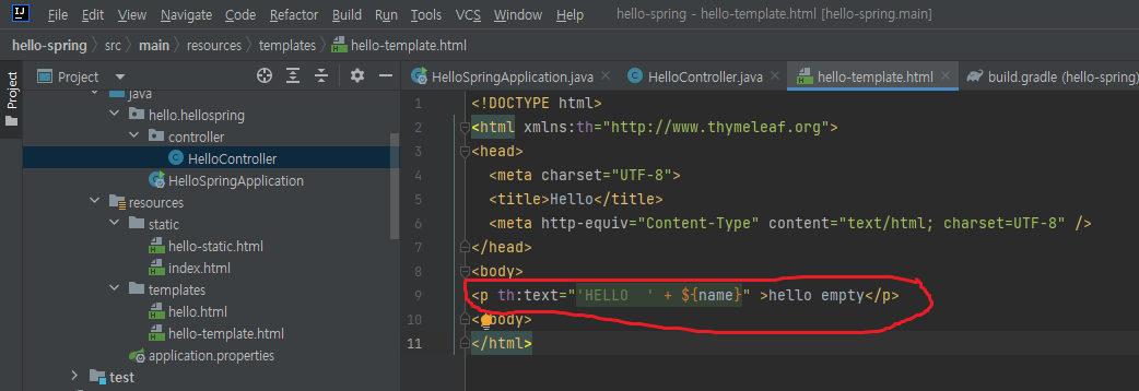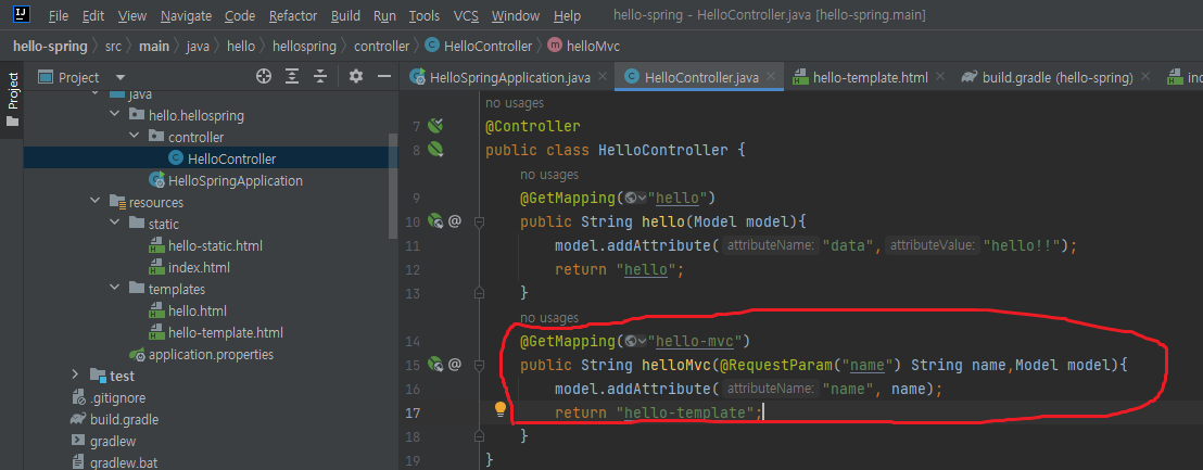 - hello-template를 return한다. 이는 'resources/templates'폴더 밑에 hello-template.html페이지를 호출하게 된다.