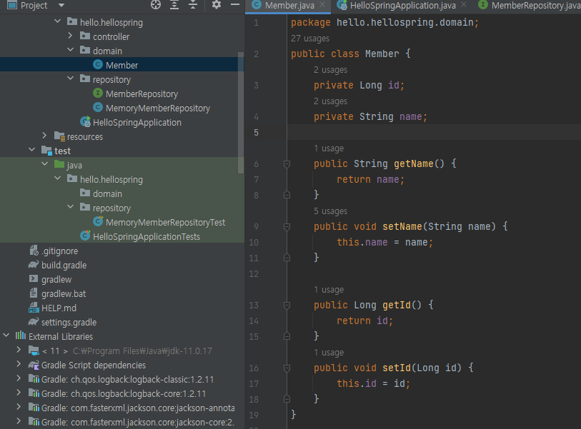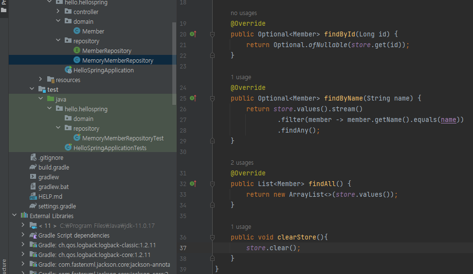 - 멤버 입출력을 위해 필요한 save, findById, findByName, findAll 메소드를 선언한다.