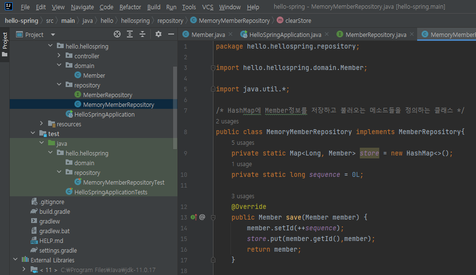 3. MemoryMemberRepository를 인터페이스를 상속하여 정의한다.