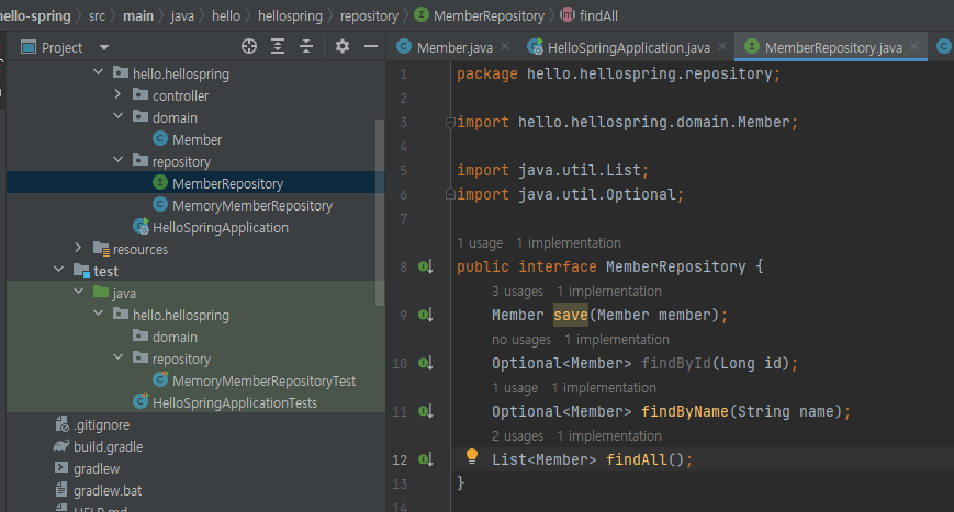 - MemberRepository 인터페이스에 커서를 대고 있다가 메소드들을 자동으로 가져온다.