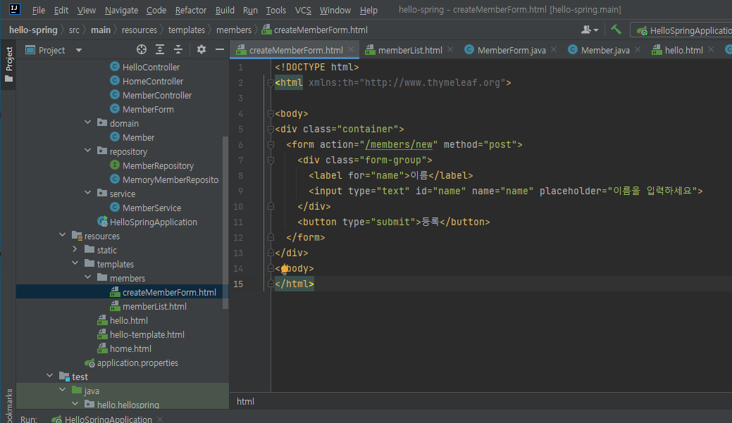 - members/createMemberForm.html화면에서 등록버튼을 눌렀을때 Post방식으로 "/members/new"가 호출되는데 이에 매핑되는 메소드 추가