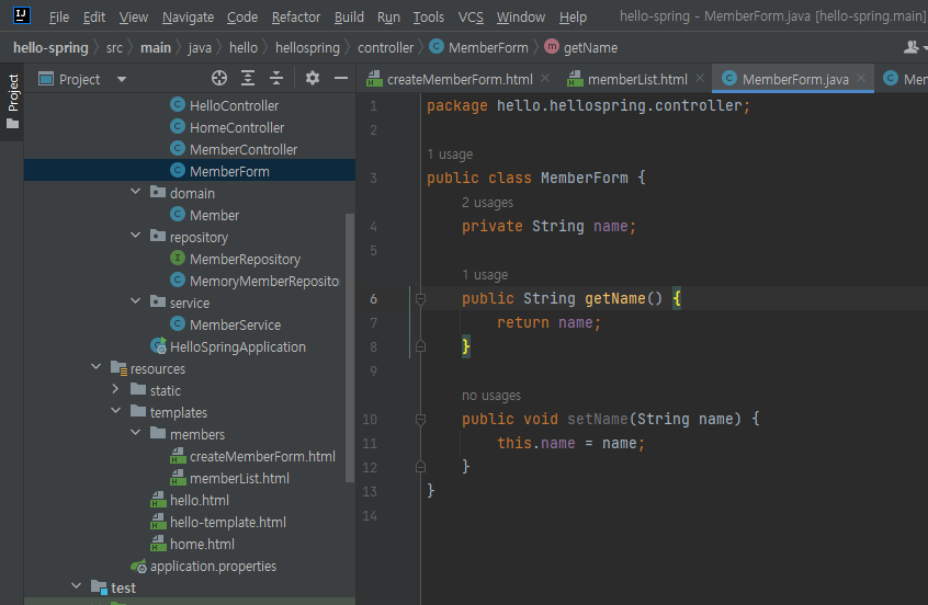- members/createMemberForm.html화면에서 input값으로 id가 name인 값을 받는데 이를 해당 메소드가 받기 위해 MemberForm이라는 클래스를 별도로 만들어서 객체를 통해 인자로 받게됨. (MemberForm 클래스 생성 필요)