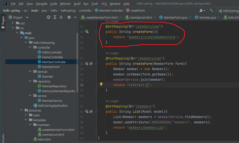 - 그래서 MemberController에서 Get방식으로 "/members/new"가 호출되었을때 members/createMemberForm.html이 호출되도록 메소드를 작성함.