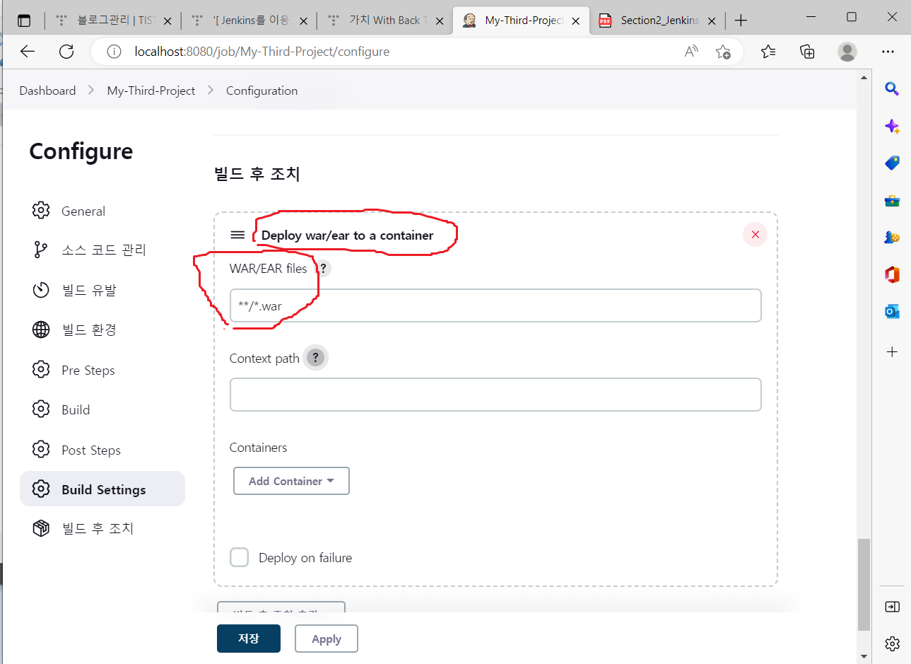 - WAR/EAR files에 **/*.war 입력. jenkins workspace에 있는 모든 war파일을 가리키는 듯