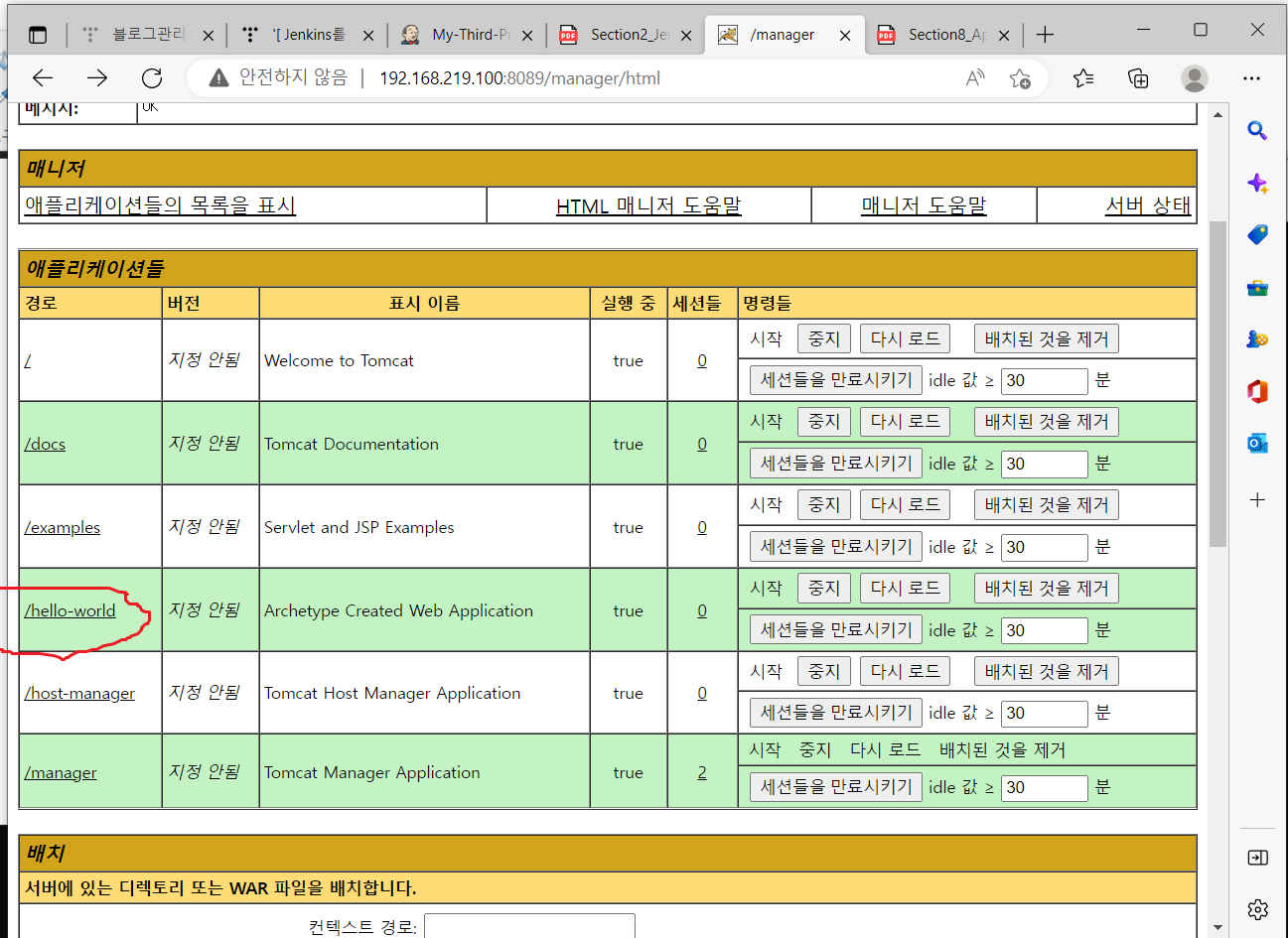 - tomcat관리페이지에서 hello-world가 생성되었음을 확인