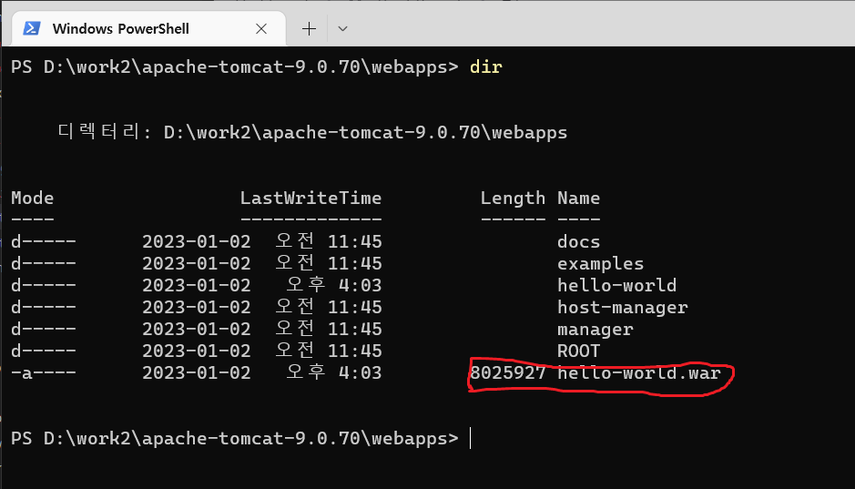 - 빌드 성공하면 hello-world.war파일이 톰켓 webapps폴더에 정상적으로 deploy되었음을 확인할 수 있다.