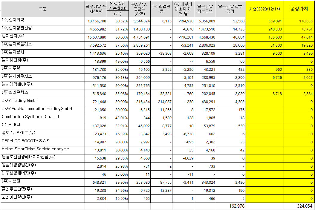LG 관계기업 지분가치 162,978억원에 대해서 상장되어있는 기업들의 공정가치만 계산했을때 324,054억원이다.
