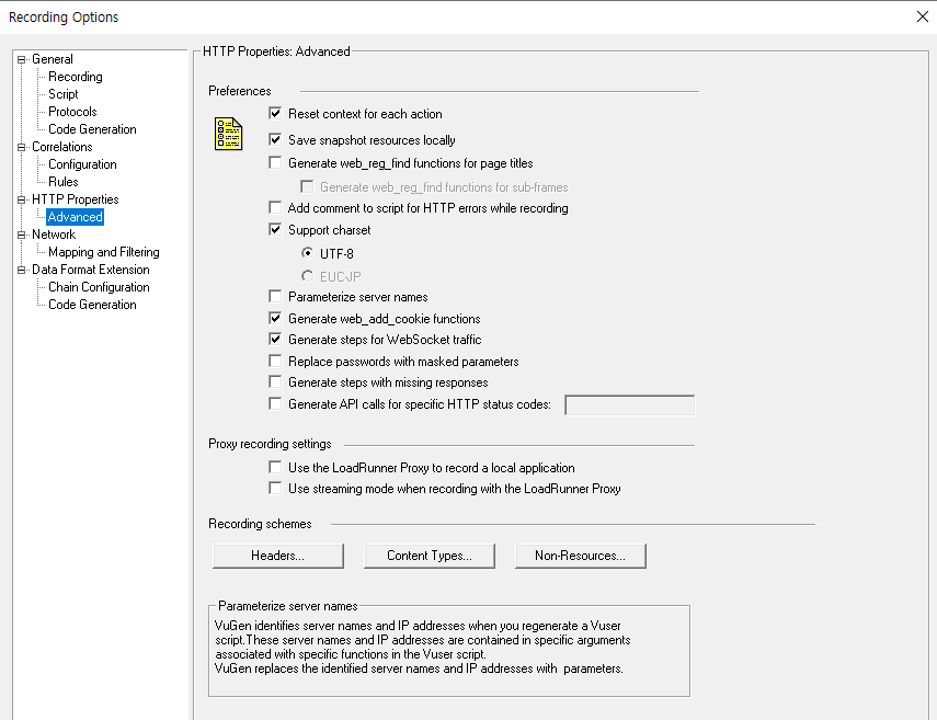 그냥 web으로 스크립트 레코딩을 했을때 그림1 과 같이 Extra Files에 WebSocketBuffer.h와 WebSocketCB.C파일이 생성되어 있으면 websocket프로토콜을 쓴다고 볼 수 있음. 단 레코딩 시 그림2와 같이 "Generates steps for WebSocket traffic"이(Default) 선택 되어 있어야 레코딩이 된다.