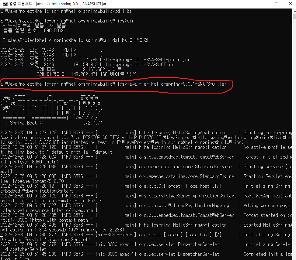 - cd build/libs 이동하면 hello-spring-0.0.1-SNAPSHOW.jar파일이 생성되어있다.
