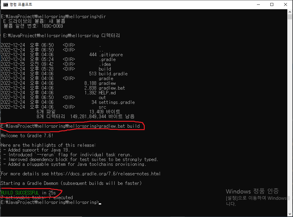 - 프로젝트 폴더로 이동하면 gradlew.bat파일이 있다. 리눅스는 gradlew파일인듯