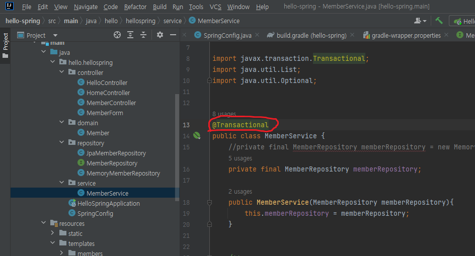 - 서비스 계층에 @Transactional을 추가하면 서비스를 수행하다 runtime error가 발생하면 Rollback하게 된다.