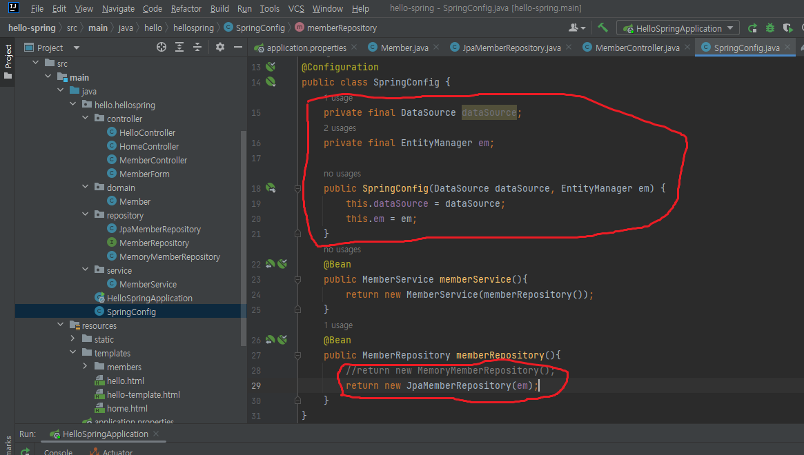 - DataSource와 EntityManager 객체를 생성 후 SpringConfig생성자를 통해 DI 받는다.