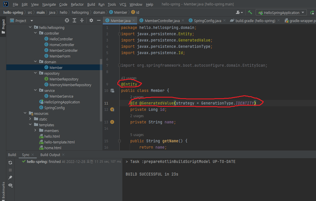 - 테이블과 매핑되는 도메인 Member클래스에 @Entiry 어노케이션을 추가한다.