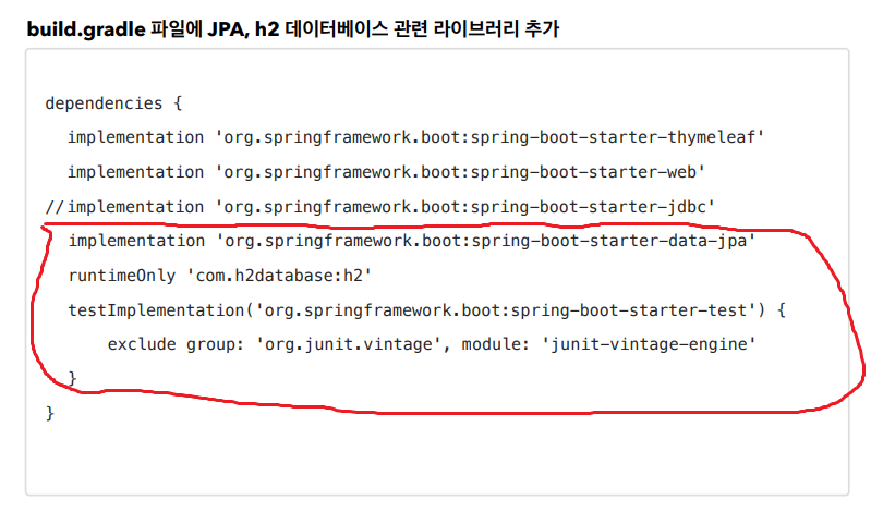 1. build.gradle 파일에 JPA, h2 데이터베이스 과련 라이브러리 추가