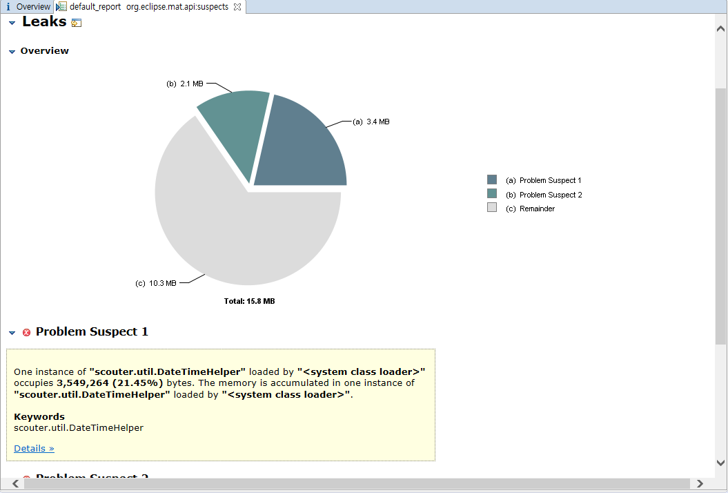 Leak suspect는 가장 큰 용량을 차지하고 있는 객체들을 좀 더 세분된 파이 도표로 보여준다. Problem suspect 1을 보면 현재 이 스레드 객체의 크기가 전체 힙 메모리의 크기 중 21.45%를 점유하고 있다는 것을 알 수 있다. 상당부분을 차지하기 때문에 OOM의 범인으로 추정할 수 있고, 일정시간마다 Heap dump를 떠서 객체크기가 증가하는지 확인한다. 해당 객체에 대한 더 자세한 정보를 얻고 싶다면 Details을 클릭하면 된다.