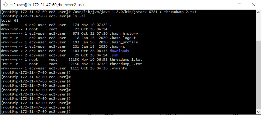jstack은 $JAVA_HOME/bin 밑에 있으며 "jstack processid" > 파일명으로 생성한다.