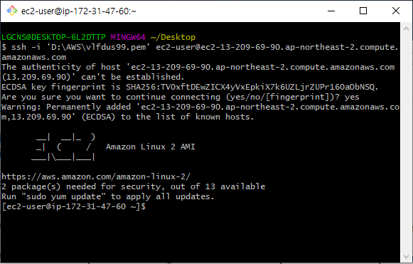 AWS에 만들어진 linux의 퍼블릭 DNS를 확인후 SSH를 통해 접속한다. 기본 계정은 ec2-user이다.