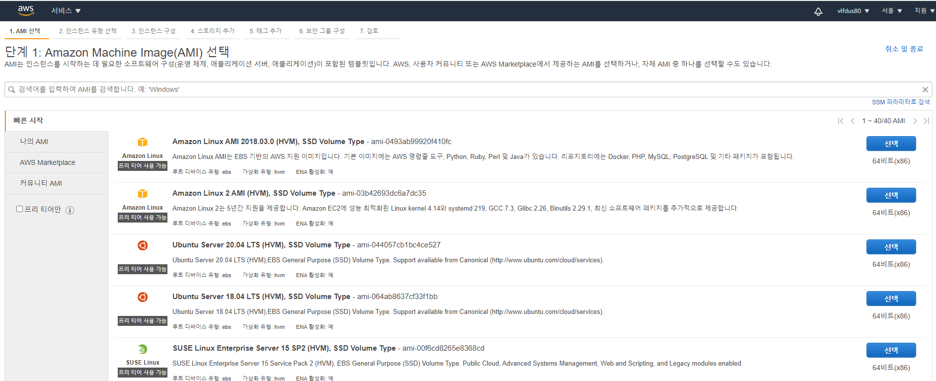 1.4 AMI는 프리티어인 "Amazon Linux 2 AMI (HVM), SSD Volume Type" 선택