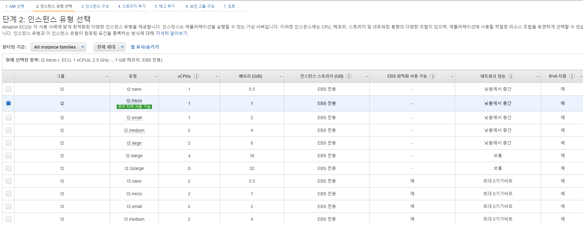 1.5 인스턴스는 마찬가지로 무료인 t2.micro를 선택