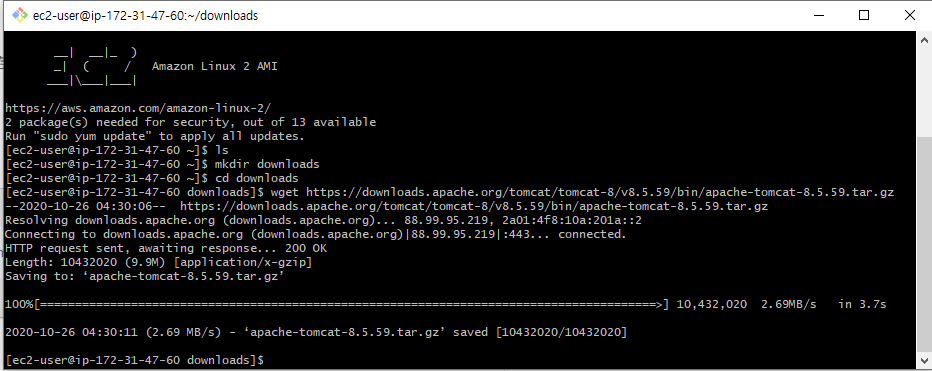 https://tomcat.apache.org 에 접속하여 download탭에서 tomcat 8버젼의 tar.gz의 다운로드링크를 복사한다. downloads폴더를 만들고 wget을 통해 tomcat8파일을 다운로드 한다.