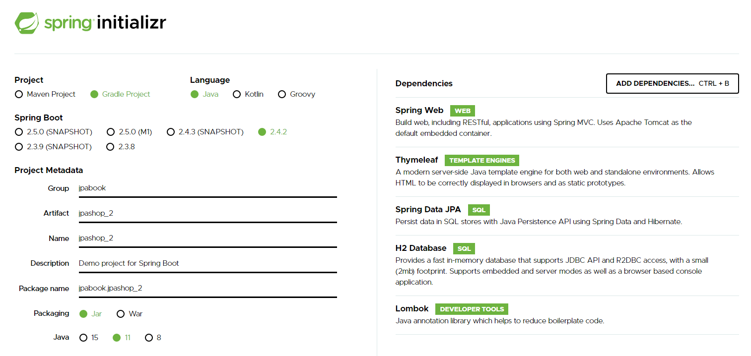 8) dependency는 Spring Web, Thymeleaf, Spring Data JPA, H2 Database를 추가